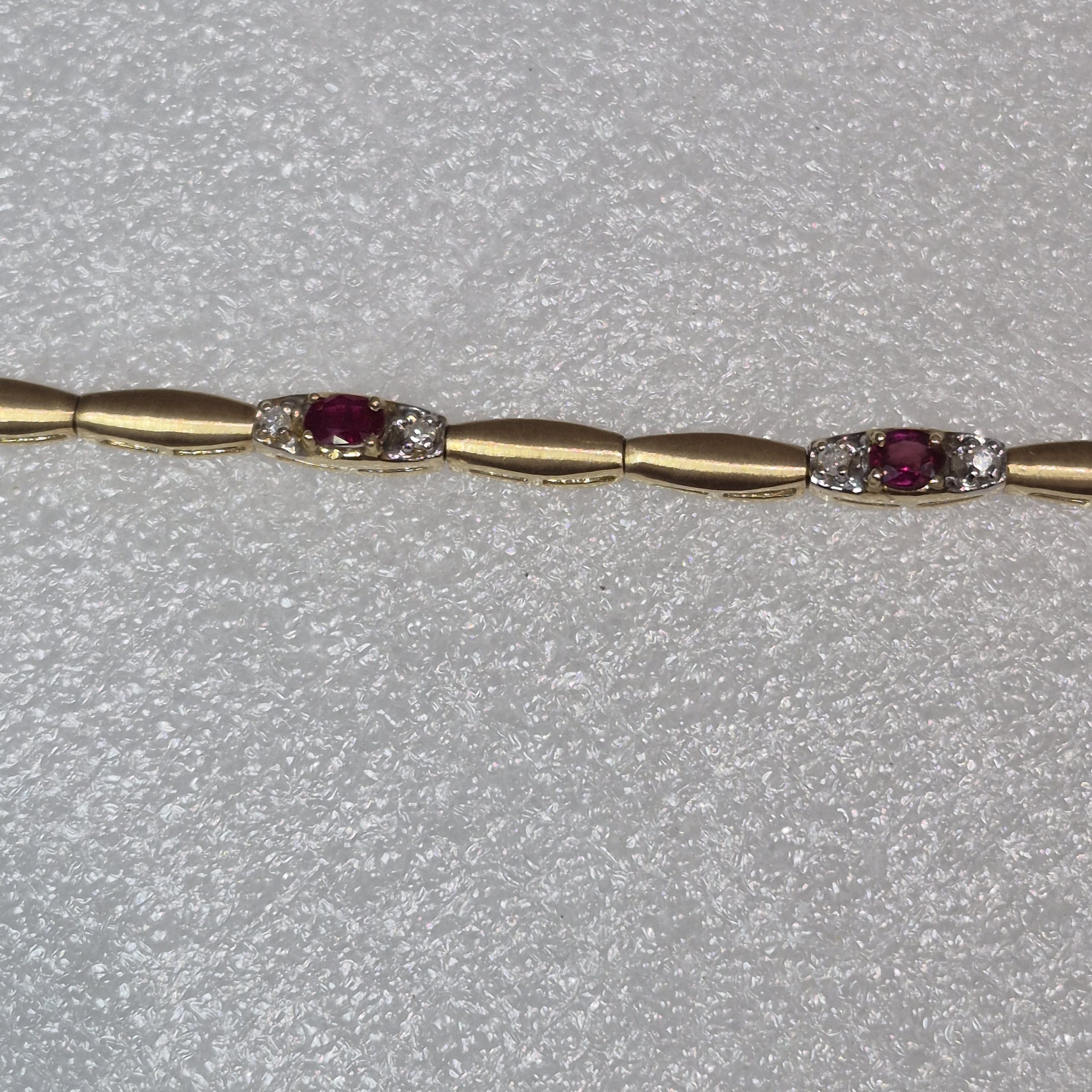 14kt Yellow & White Gold Ruby & Diamond Fashion Bracelet Weighing 7.8dwt that looks much more impressive in person with Oval Shape, Beautiful Red Rubies and Accent Round Diamonds that Weigh .35ctw. It is capable of adding diamonds to the links as an add a diamond bracelet and will be the talk of the night where ever you wear it. Fine Quality, Amazing Beauty, easily upgradeable and Very Special with color that will simply amaze you and everyone else around you, and all this is available through MSG Jewelers at $2850.00 MSG Stock Number: MSG17668. Â We strictly grade all diamonds according to GIA standards and all are natural earth grown diamonds. Appraisal available upon request at time of purchase. NOTE: ALL SALES ARE FINAL IN THIS LIQUIDATION SALE!!