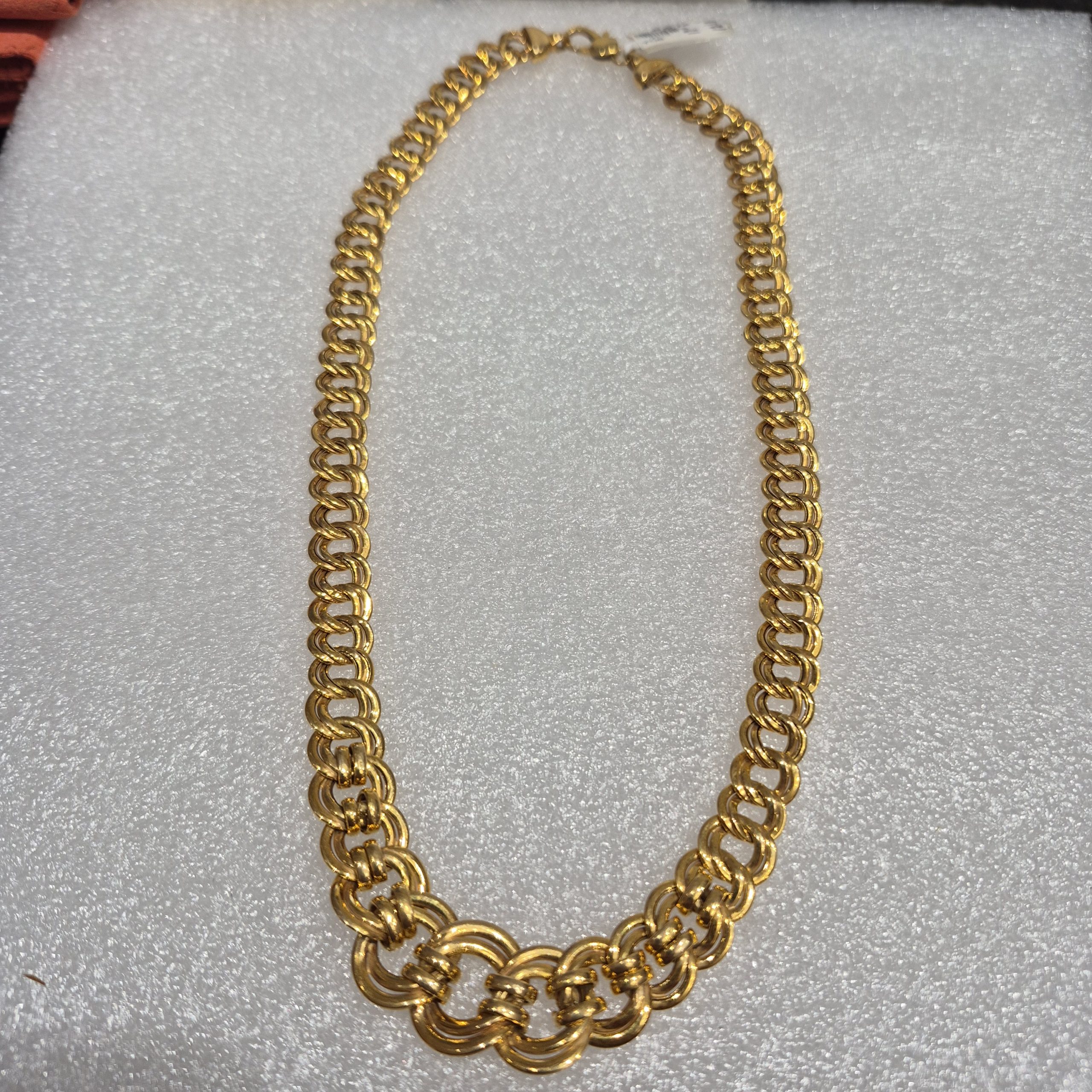 14kt Yellow Gold Lady’s 17″ Graduating Double Link Fashion Necklace with a Bold Pattern and Weighing 12.1dwt..This Necklace gives a Large, Major Look without the Huge Price and it is the Answer for YOU if you treasure the Unusual. This  Quality Necklace is Design for Comfortable Wear and is Now Available at an UNBELIEVABLE Price of $2785.00, from who else but MSG JEWELERS, of course. Stock Number: MSG7457. Buy it NOW ONLINE or TEXT a pic and stock number to 314.353.9488 to see it in our office. Guaranteed to be sold FAST with this low price. Diamond quality available upon request. All diamonds are hand selected by Mike George, Owner of MSG Jewelers, Inc.. We strictly grade all diamonds according to GIA standards and all are natural earth grown diamonds. Appraisal available upon request at time of purchase. NOTE: ALL SALES ARE FINAL IN THIS LIQUIDATION SALE!!!