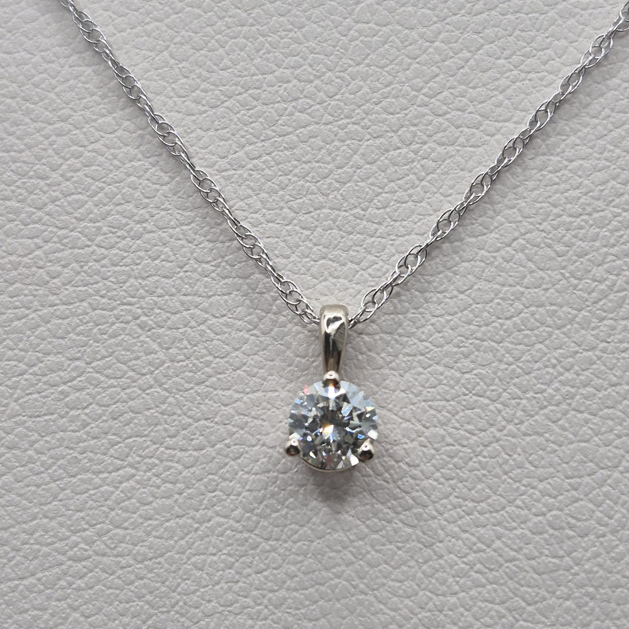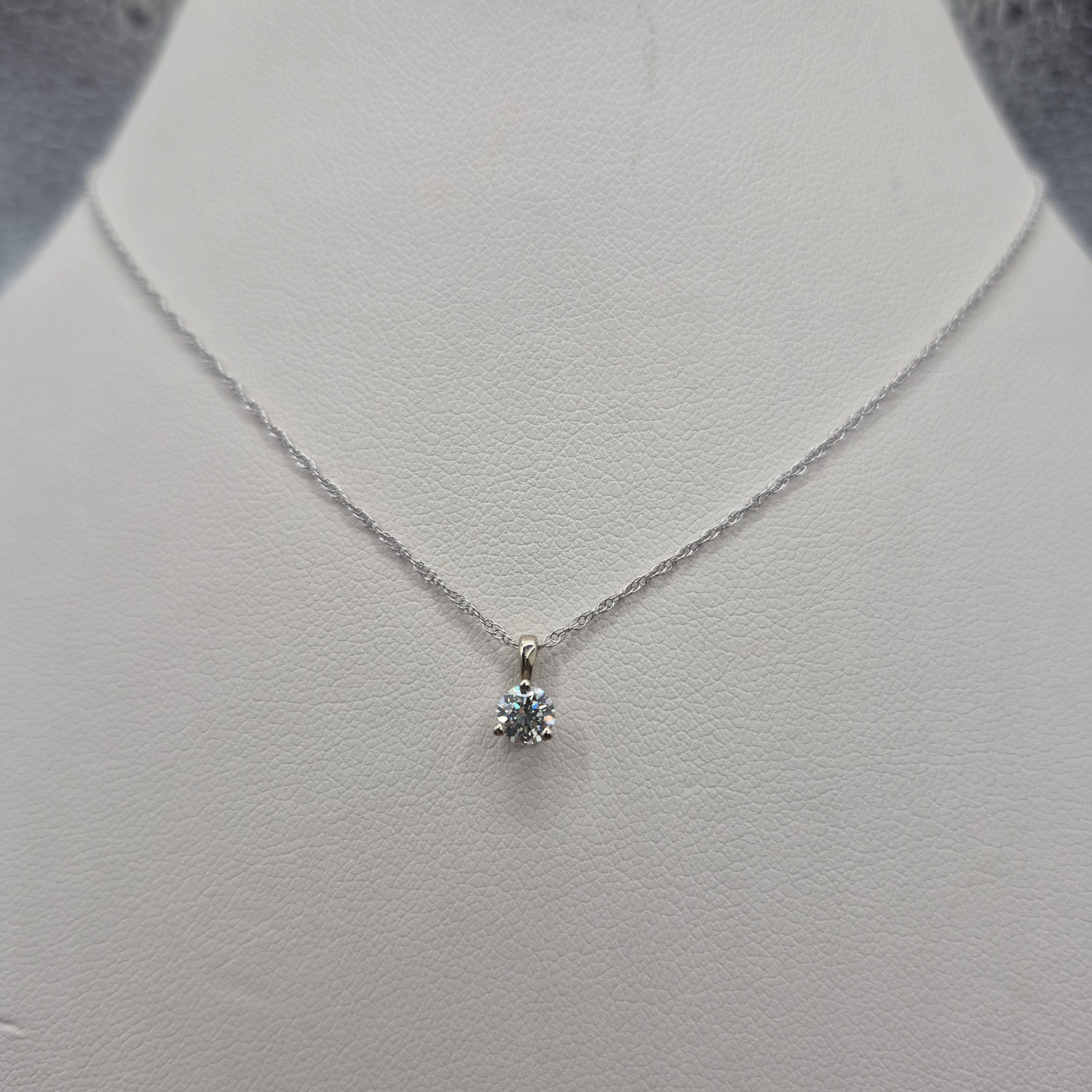 Take a LOOK at this Lady’s Solitaire Round Brilliant Cut Diamond set in 14kt White Gold on a Delicate Light Rope Chain. This Diamond is Well Cut with a lot of Sparkle having a weight of .25ct., with a Clarity of VS1 and Color of “I”. The Chain included as pictured is a 16″ Triple Link style in gold. Stock Number: MSGA0000. Hurry, because it will go fast. All diamonds are hand selected by Mike George, Owner of MSG Jewelers, Inc.. We strictly grade all diamonds according to GIA standards and all are natural earth grown diamonds. Appraisal available upon request at time of purchase. NOTE: ALL SALES ARE FINAL IN THIS LIQUIDATION SALE!!!